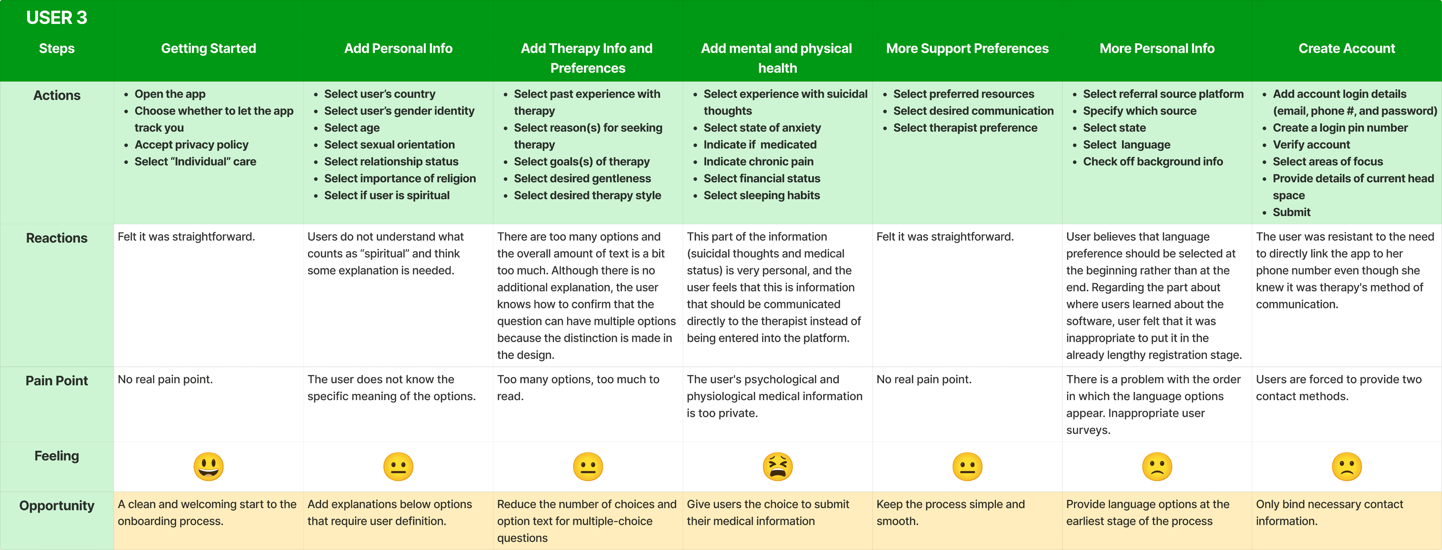 This emotional journey confirmed that even a well-intentioned flow can backfire without clear grouping, empathetic pacing, or user control. These findings directly informed our redesign strategy to reduce friction, build flexibility, and better support users’ mental state during onboarding.