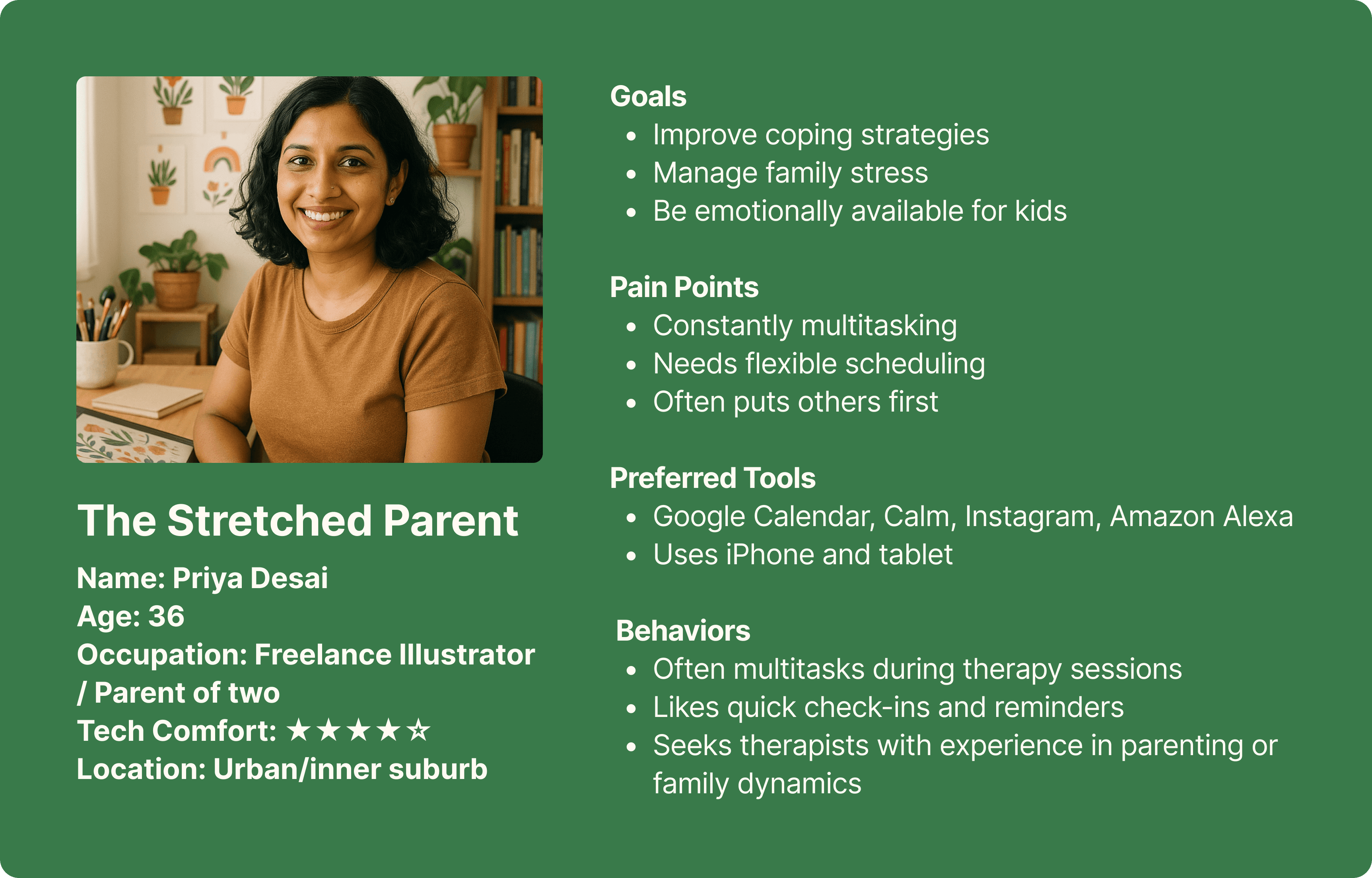 These patterns led us to develop a focused user archetype, “The Stretched Parent,” to represent a key segment of our audience. We also created user stories to reflect their specific goals, frustrations, and needs.
