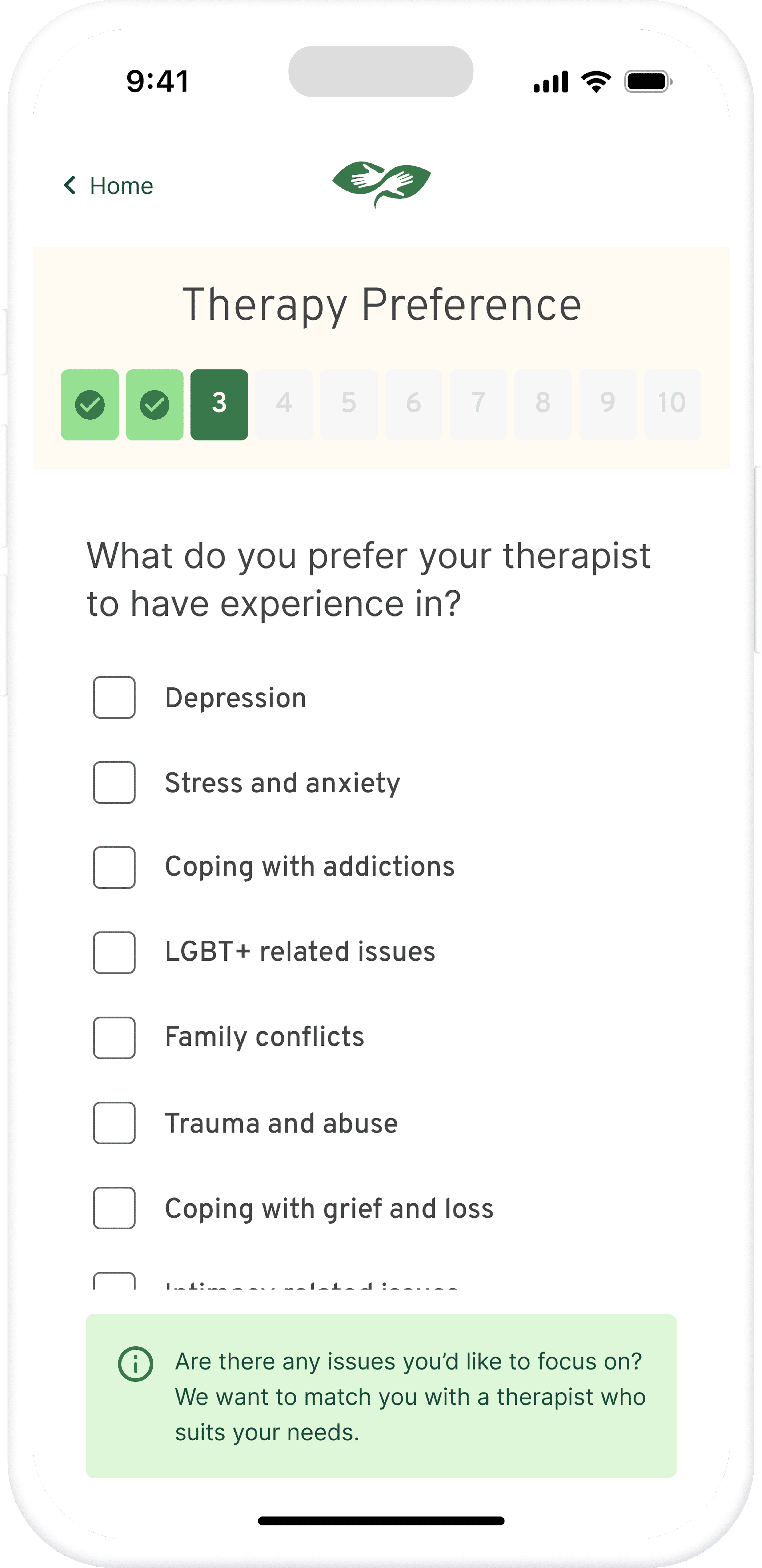 Some question categories (e.g., therapy preferences vs. support resources) are spread across different stages, making it harder for users to follow the logic.