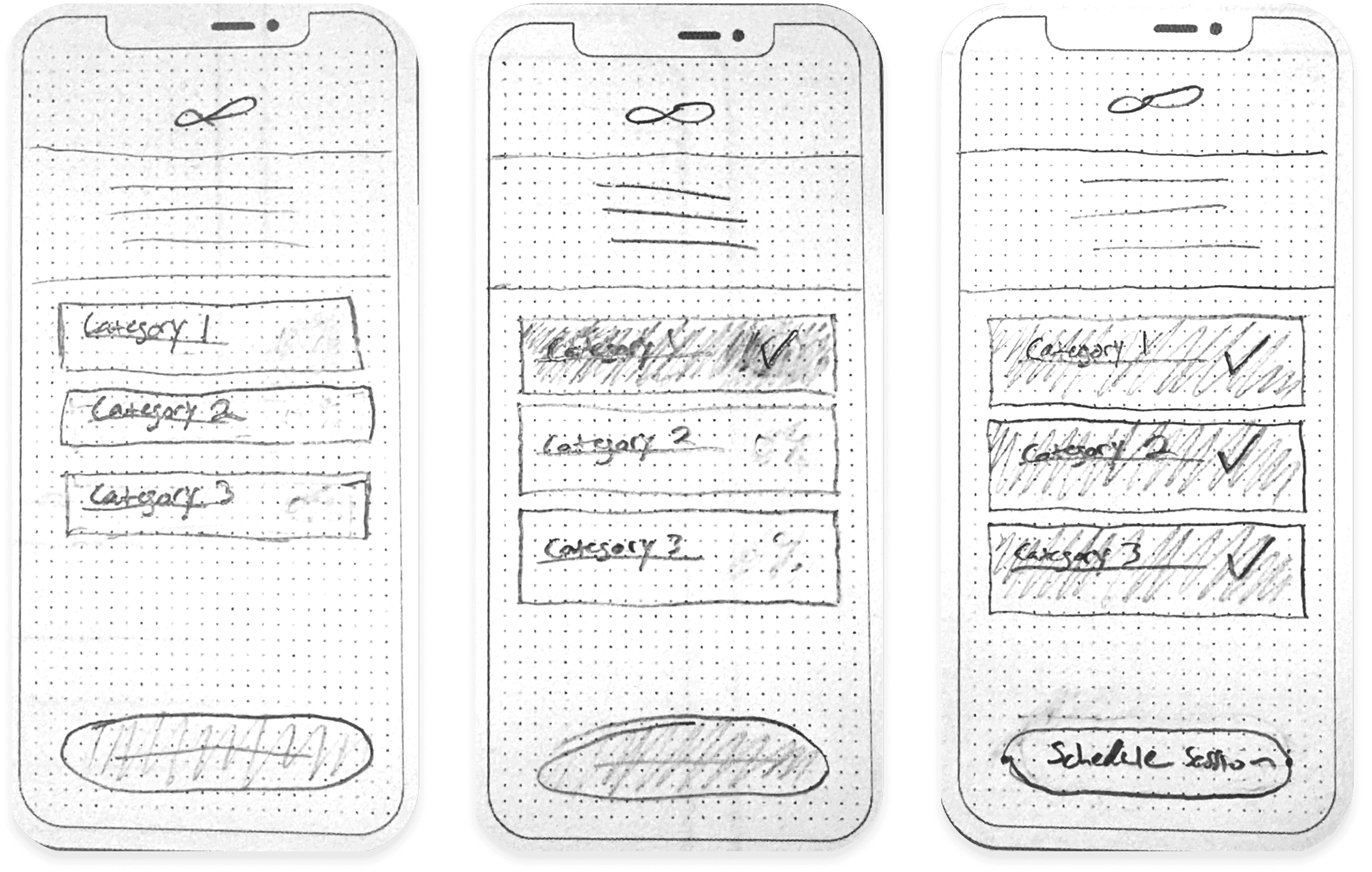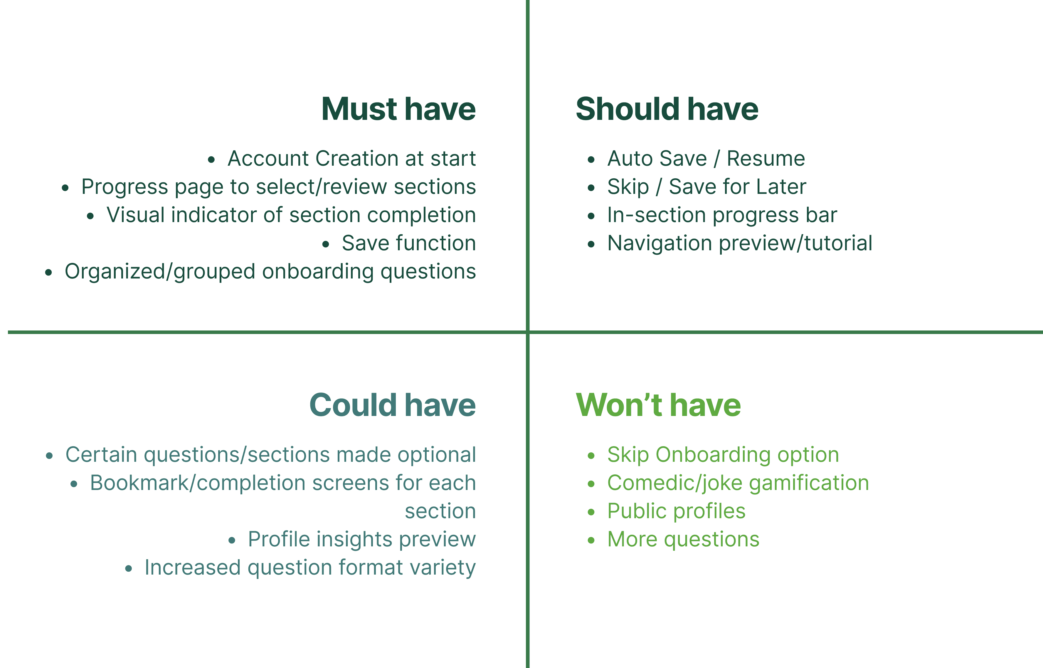 The only way a new central navigation screen would work for onboarding was if questions were categorized. This was our focus at the start of our re-design stage after our Feature Prioritization. We took the questions from the existing onboarding and broke them down into different stages, grouping questions that would feel connected for the user. Our re-organizing also meant moving the account setup stages to the start of the process to allow for the saving of progress for the user.