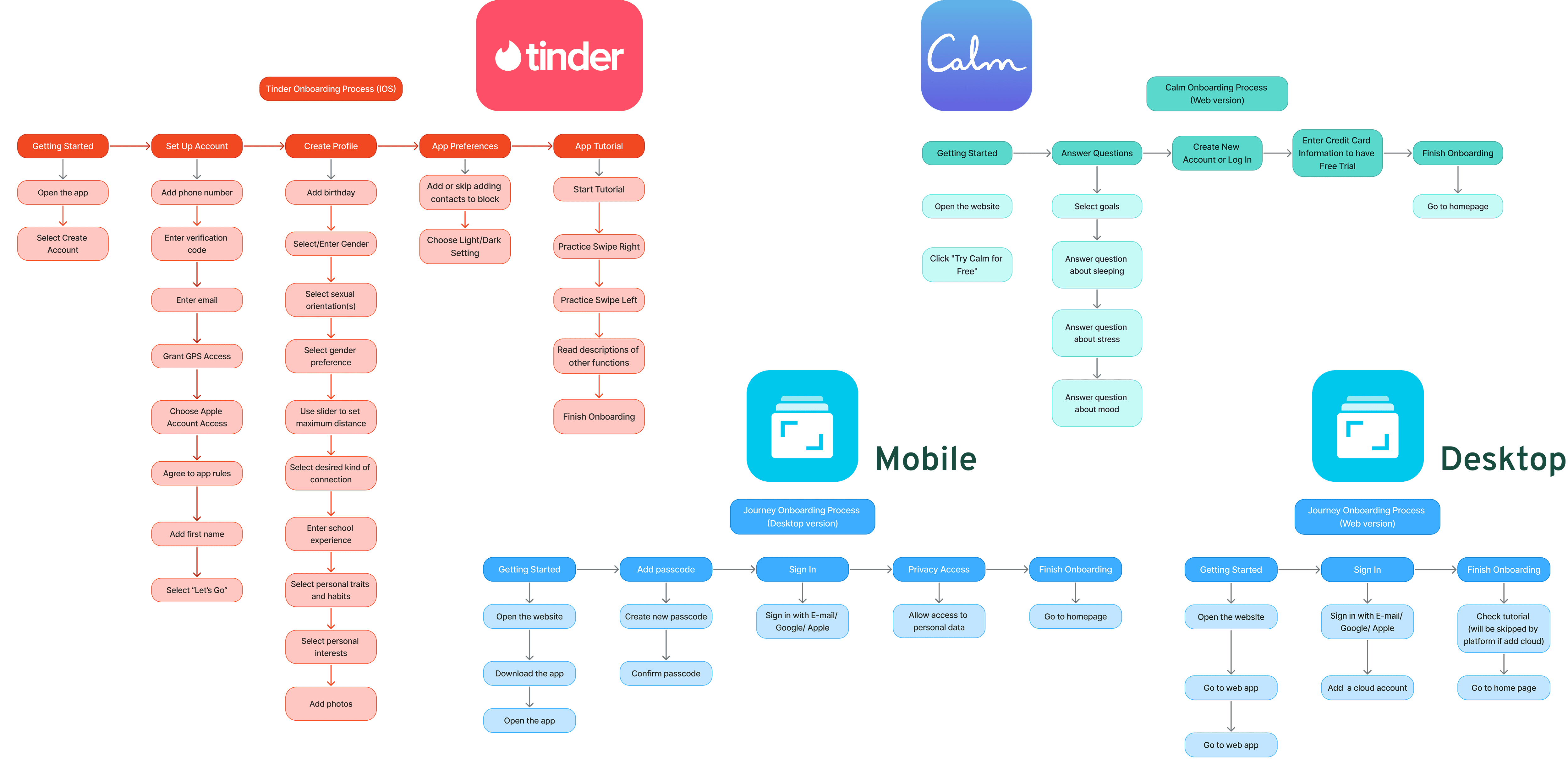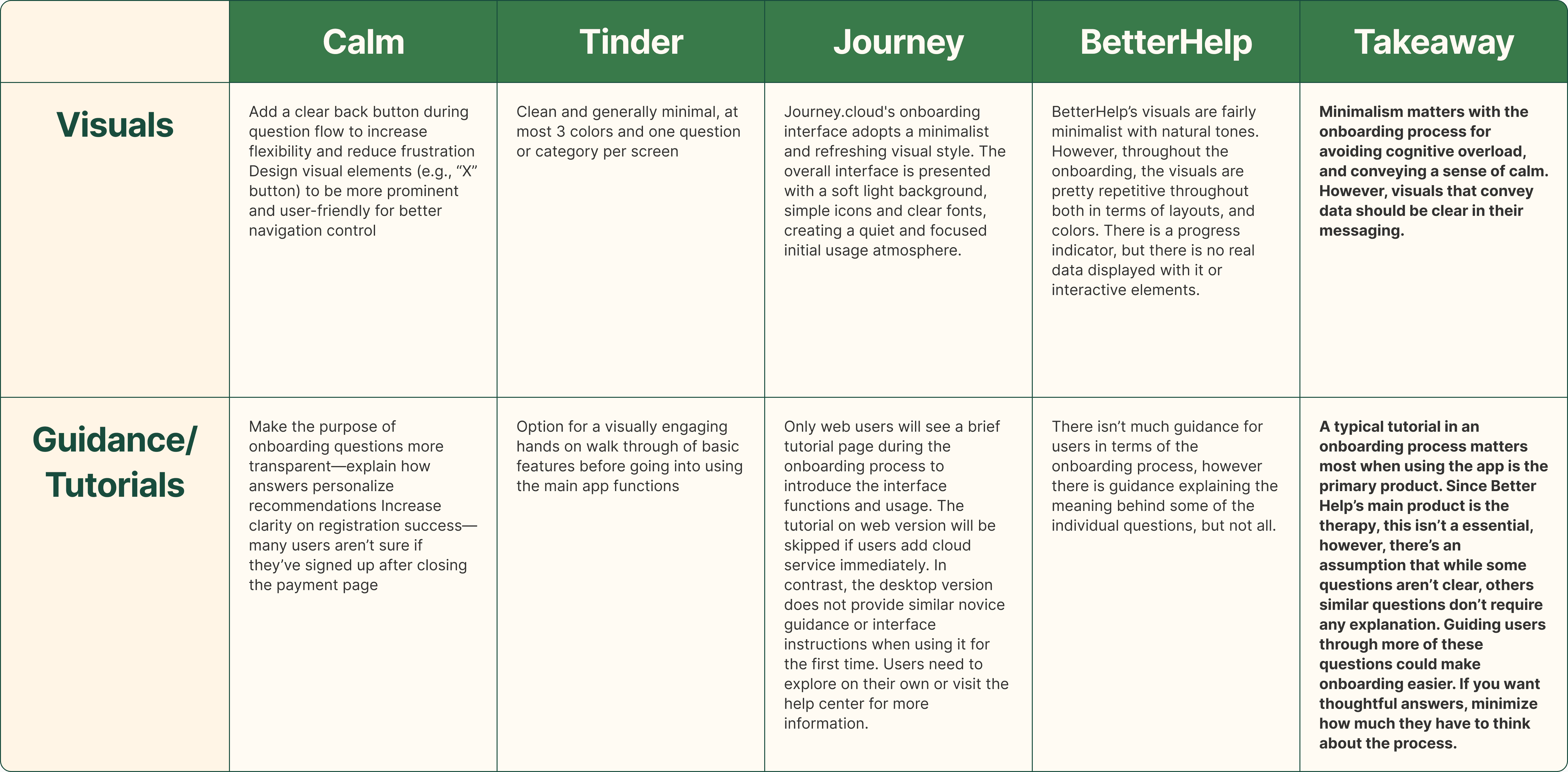 To broaden our understanding of effective onboarding, we conducted a competitive analysis across three different apps: Calm, Tinder, and Journey. While each serves a different purpose, they all guide users through sharing personal information or setting preferences.