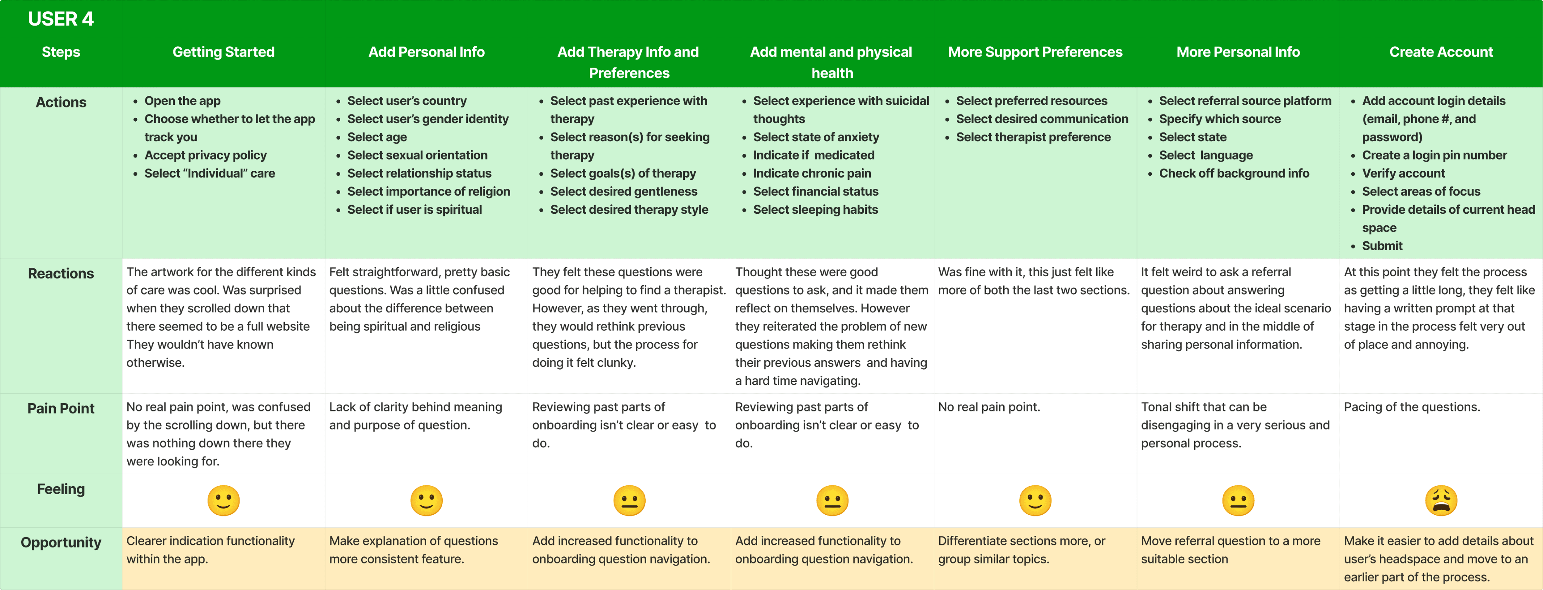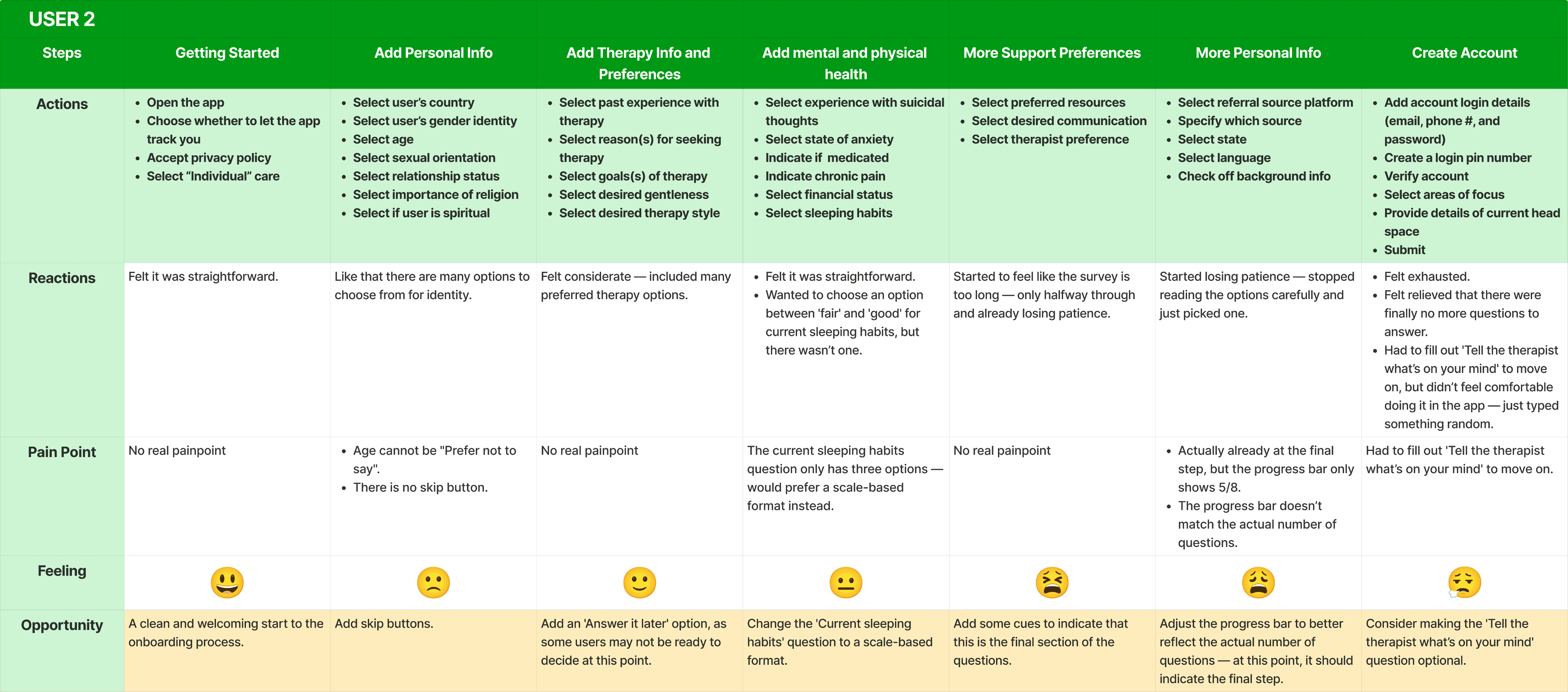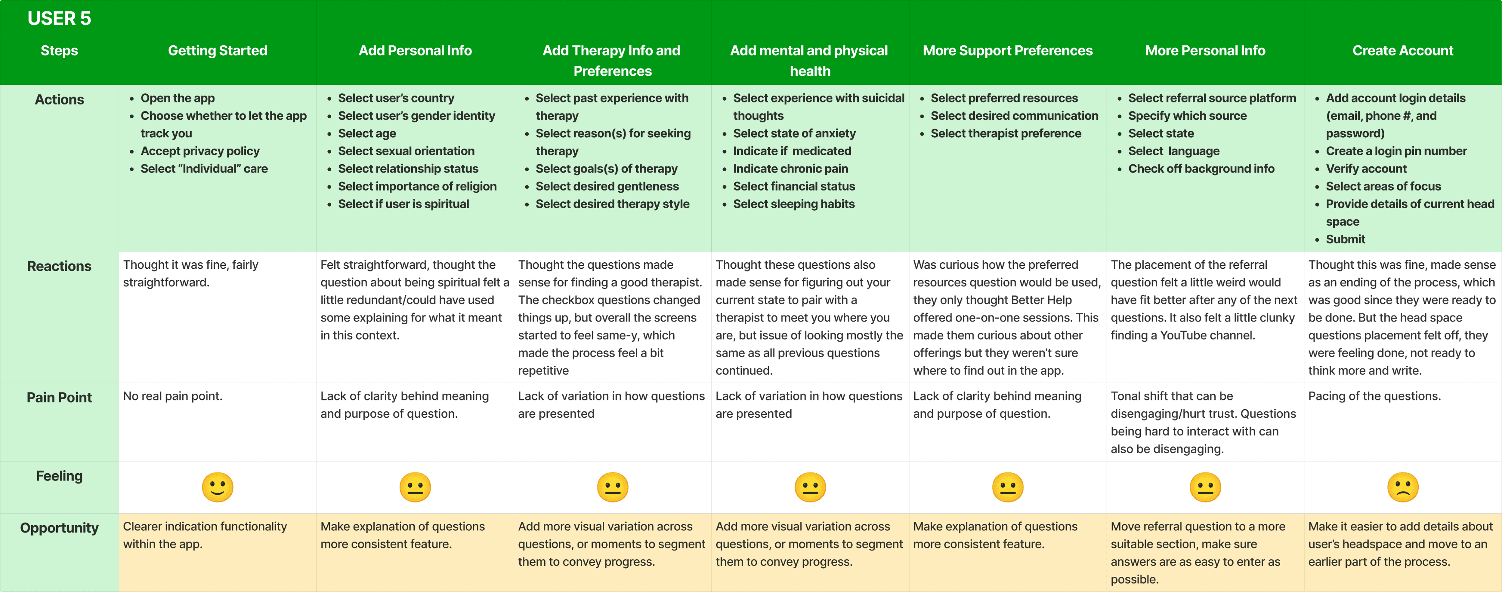 To build on our interview insights, we mapped the onboarding experience of five participants step-by-step through the current BetterHelp iOS flow. These user journey maps highlights how friction accumulates across the process, not just through individual questions, but also through how topics are grouped and presented.