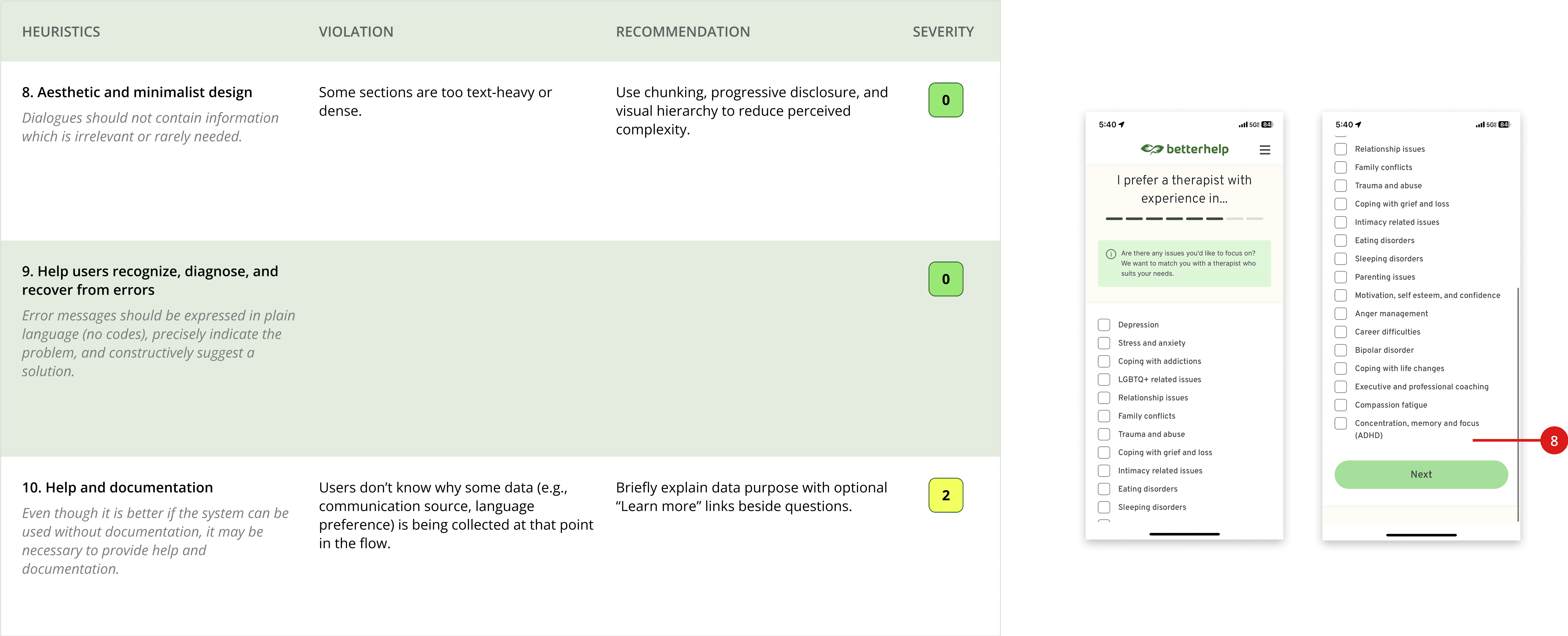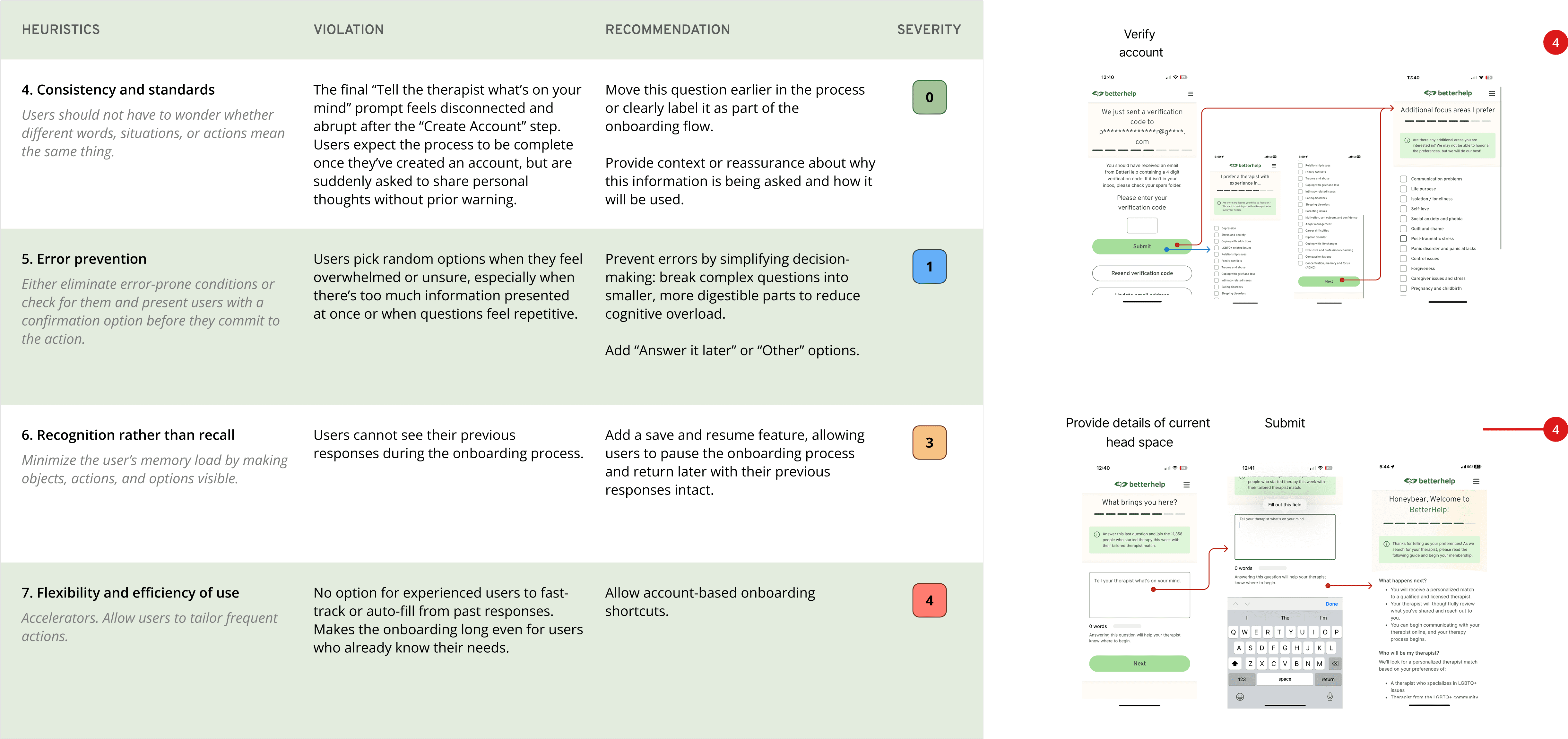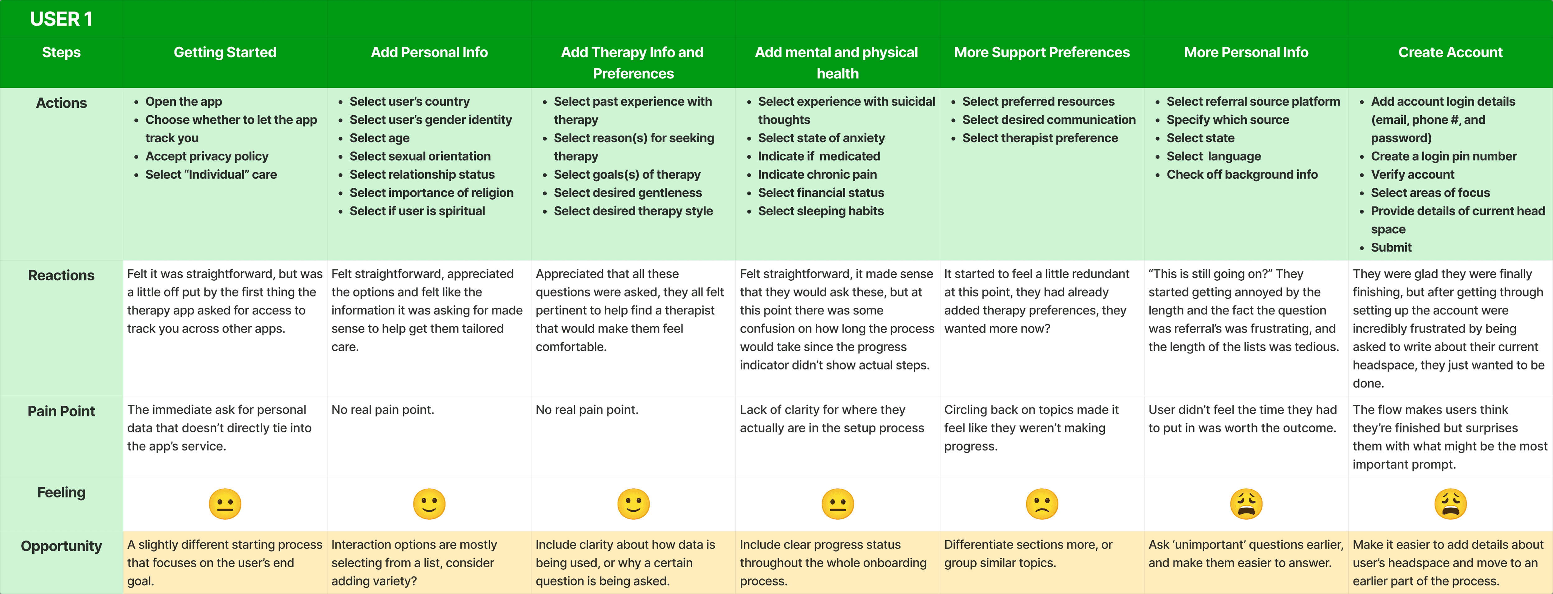 To build on our interview insights, we mapped the onboarding experience of five participants step-by-step through the current BetterHelp iOS flow. These user journey maps highlights how friction accumulates across the process, not just through individual questions, but also through how topics are grouped and presented.