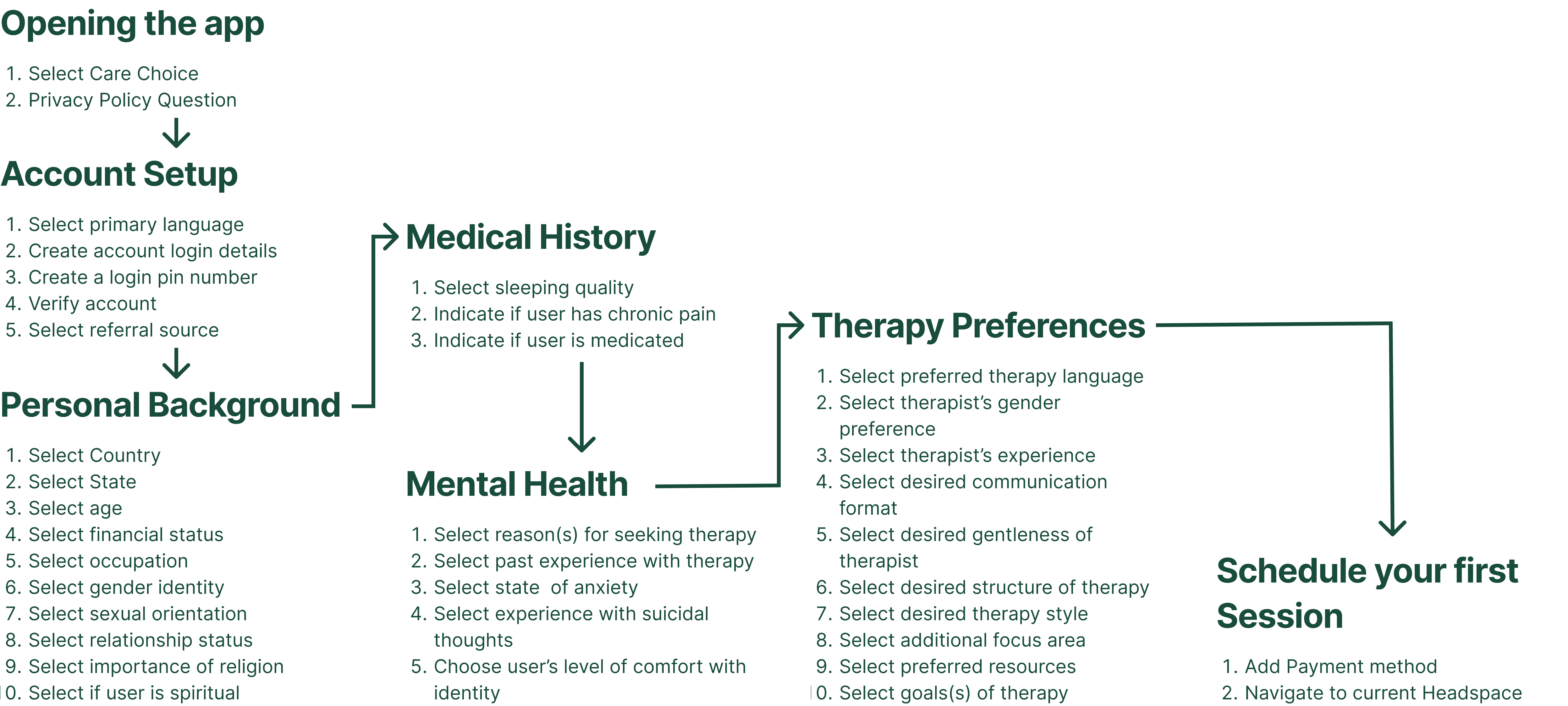 The onboarding process includes 7 distinct stages, requiring users to provide a wide range of information—ranging from demographics and therapy preferences to mental health status.