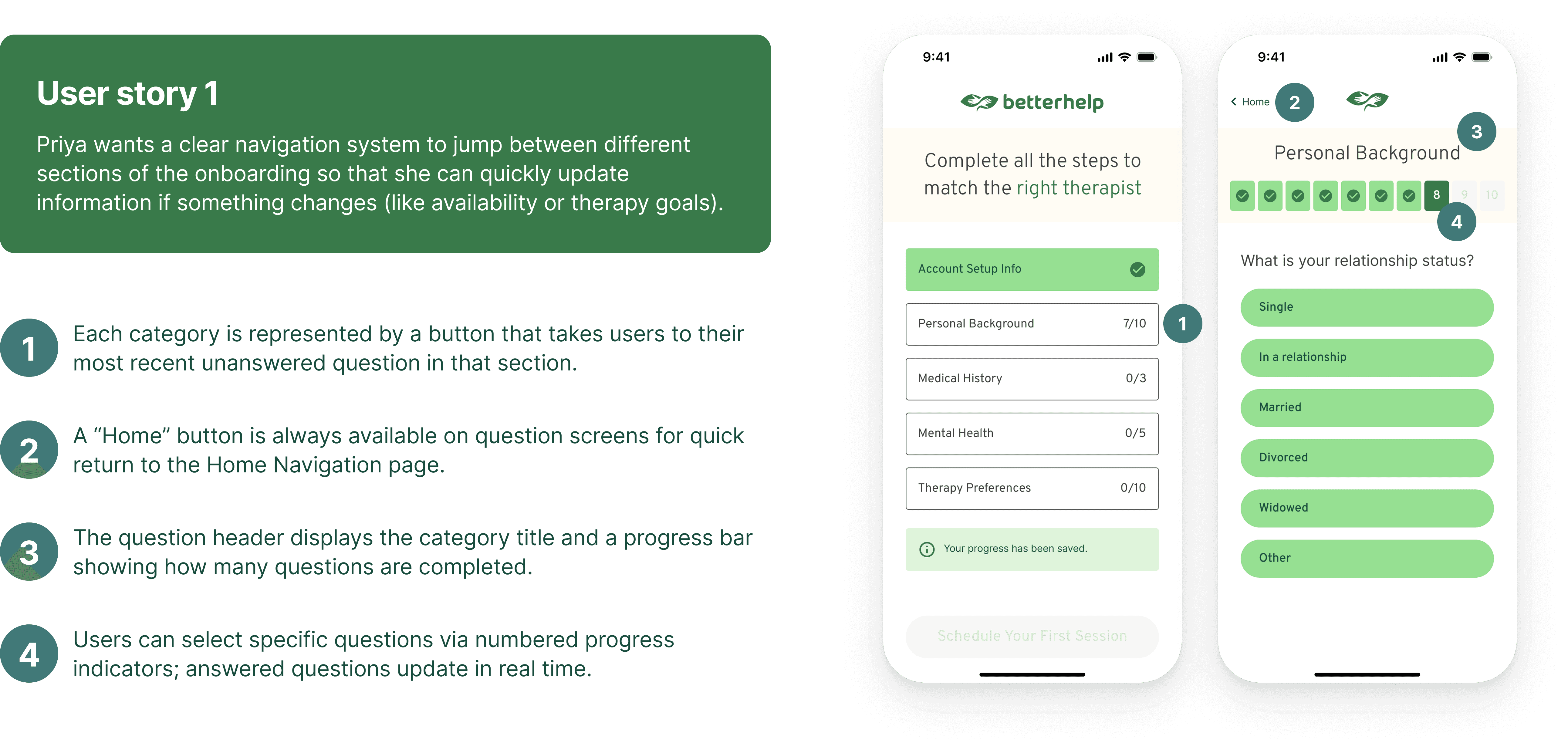 Priya wants a clear navigation system to jump between different sections of the onboarding so that she can quickly update information if something changes (like availability or therapy goals).