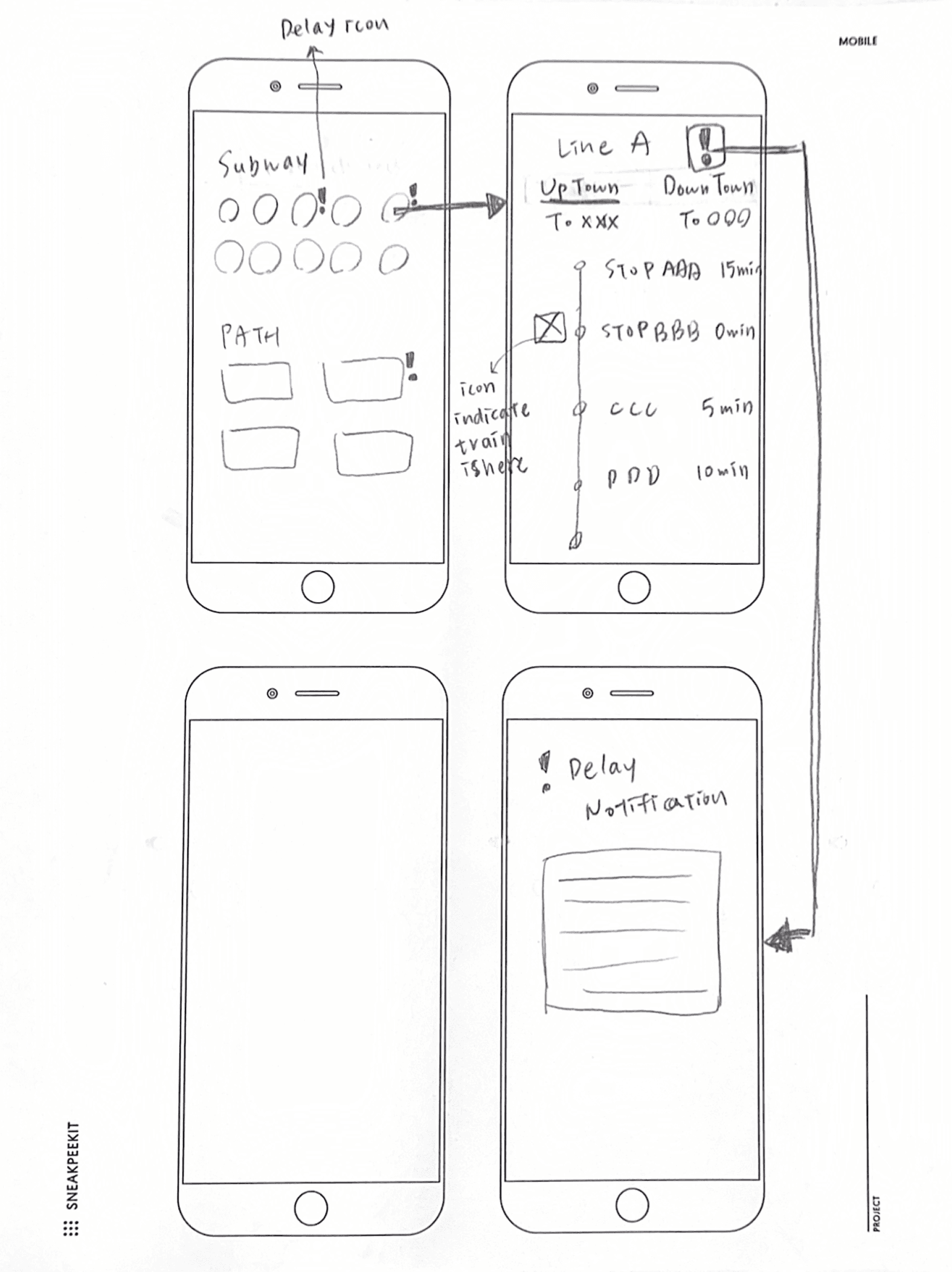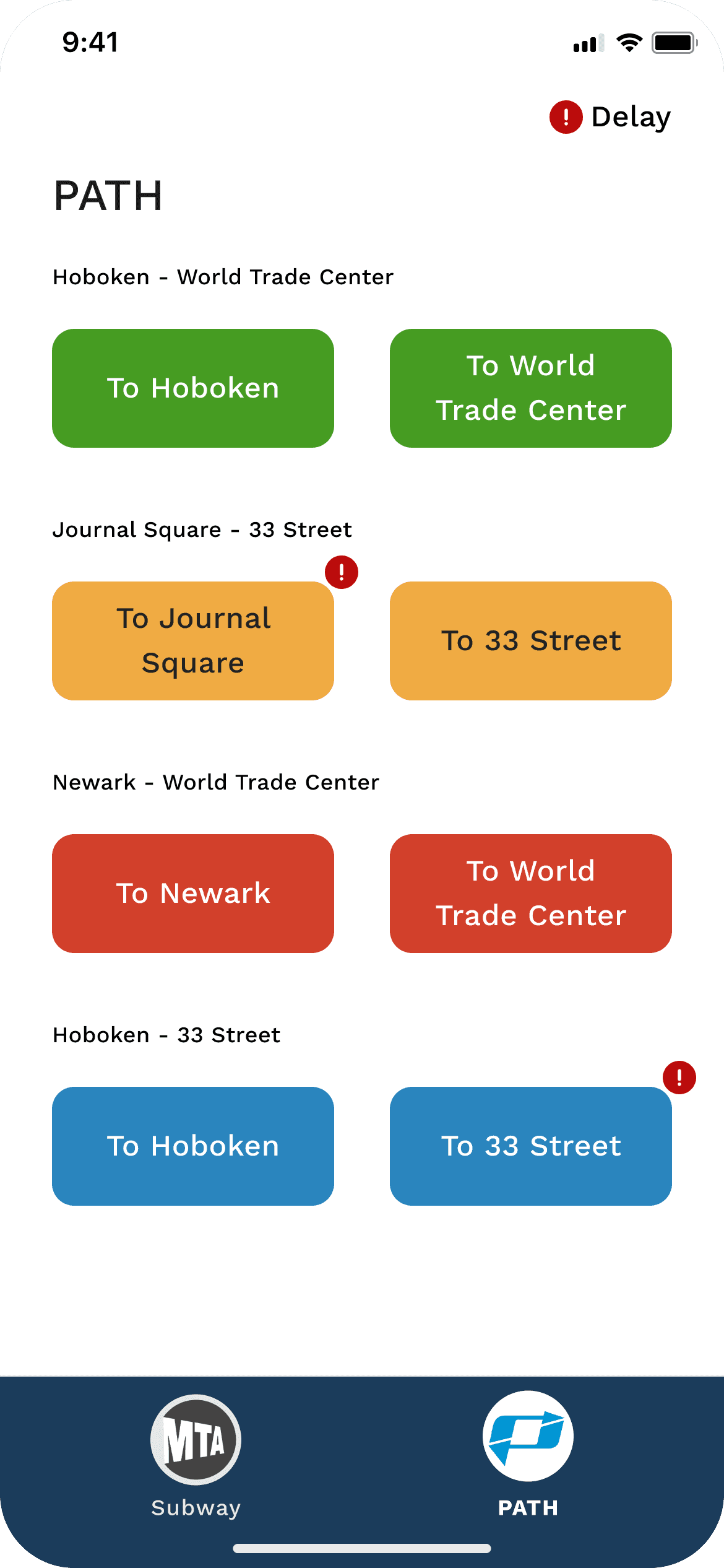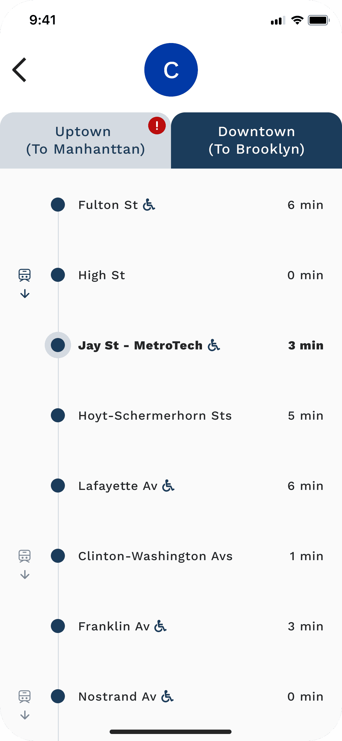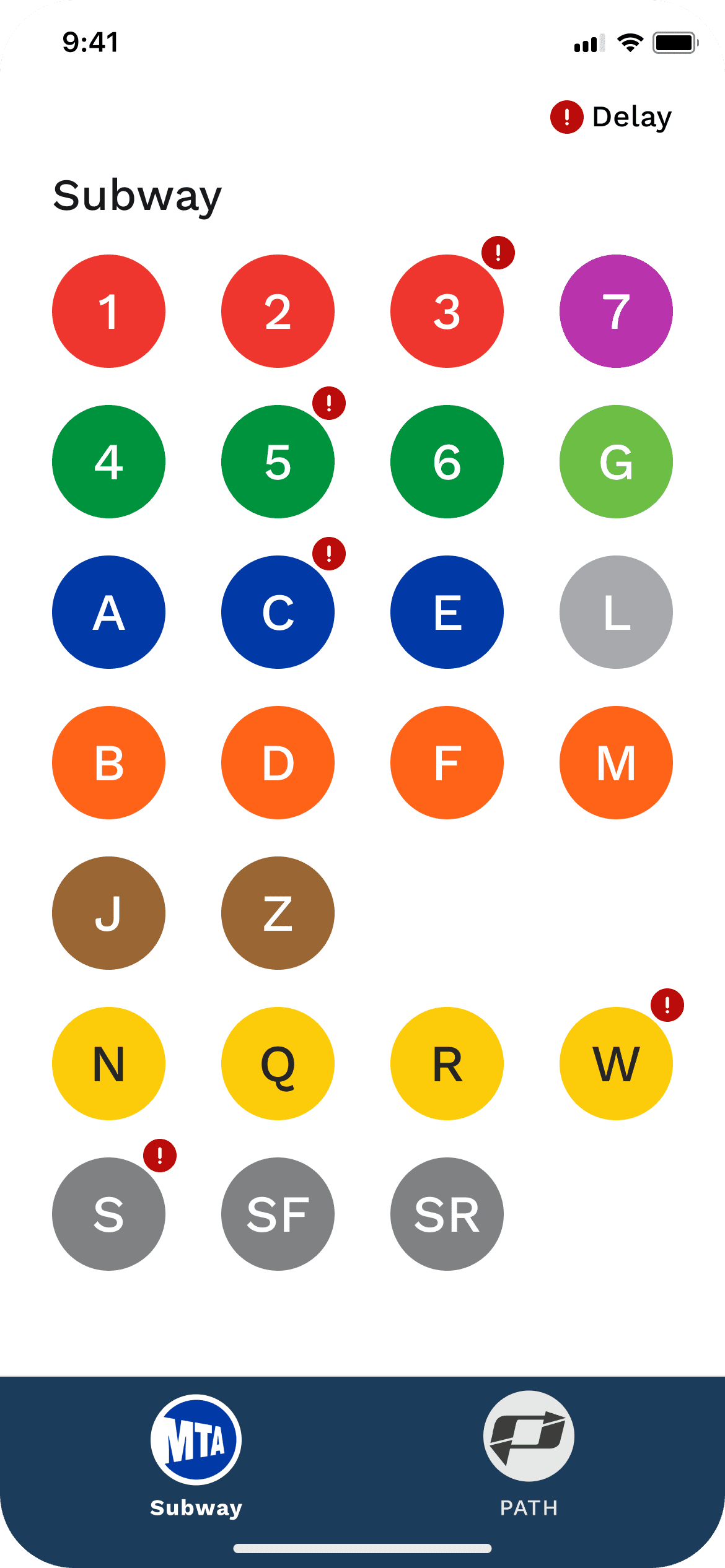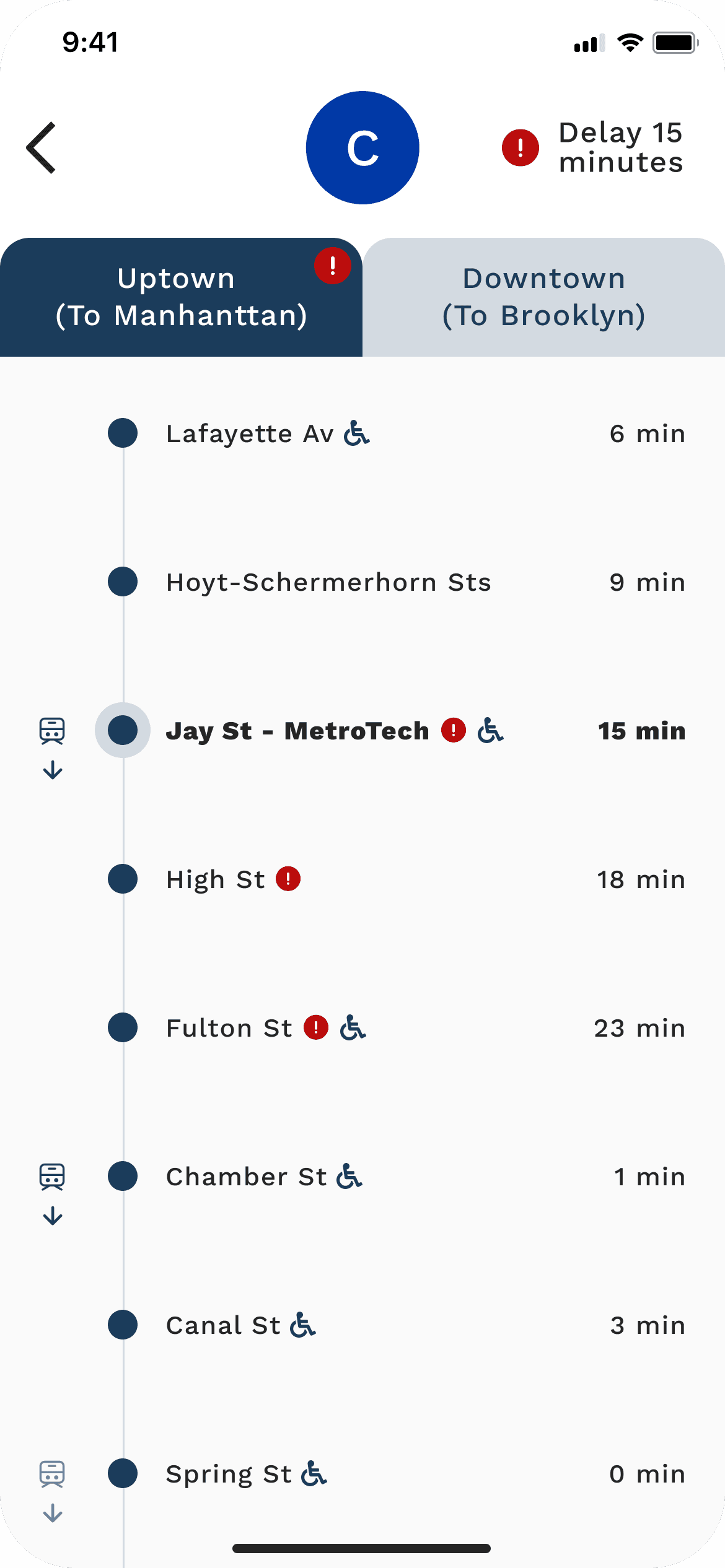 Use a small exclamation mark to indicate delays, with affected stations clearly marked