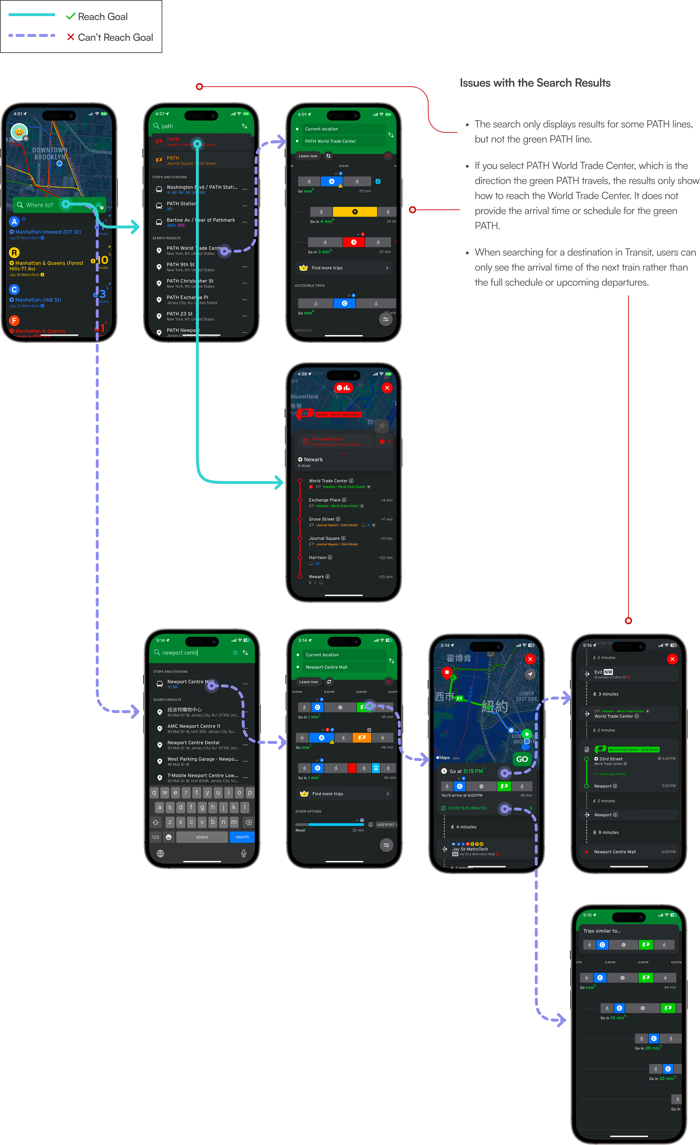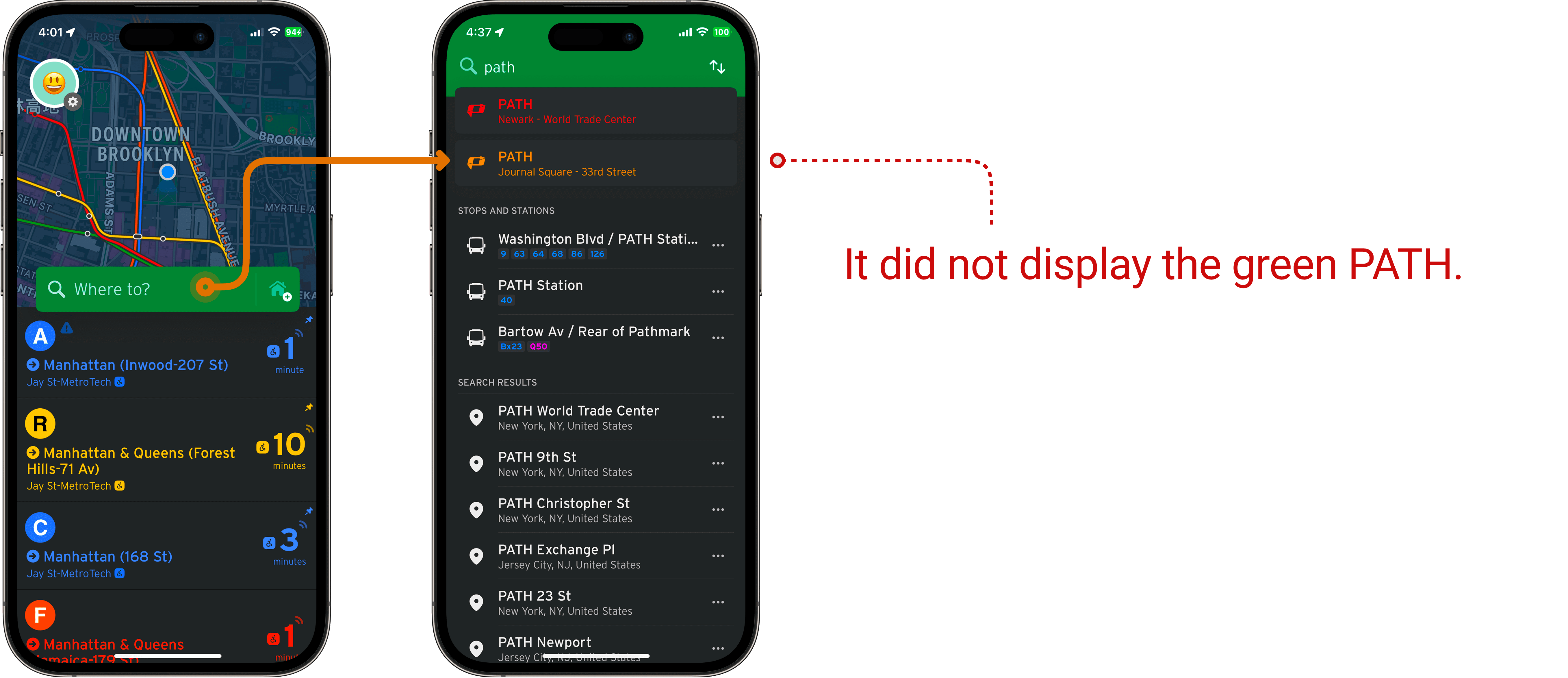 Searching for "PATH" in the search bar – Since PATH trains are identified by color rather than unique names, users try searching for "PATH." However, not all PATH lines appear in the results, and the specific line they are looking for is missing.