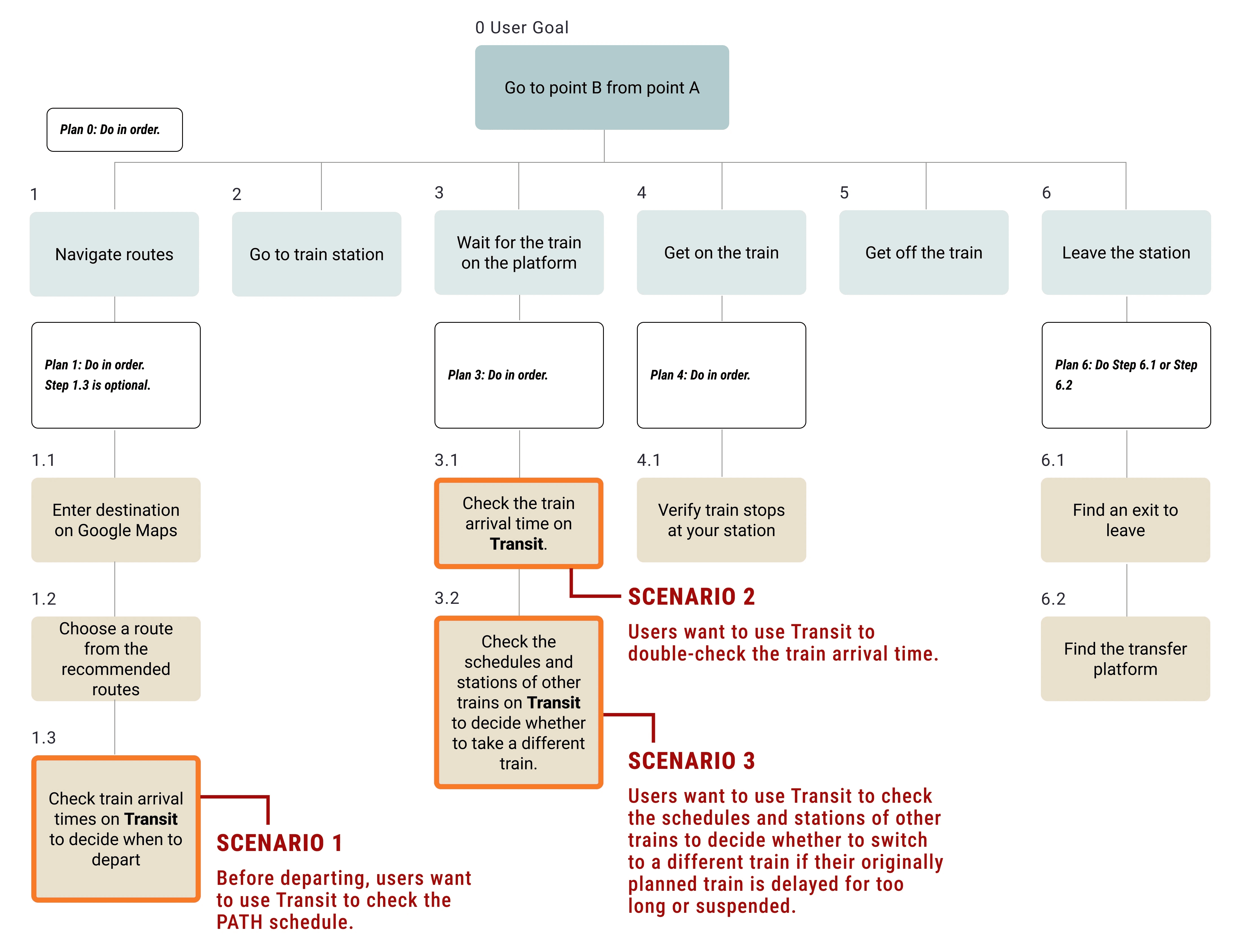The sections highlighted in orange indicate the parts where Transit is involved. Scenario 1 will be the focus of the task analysis for the user.