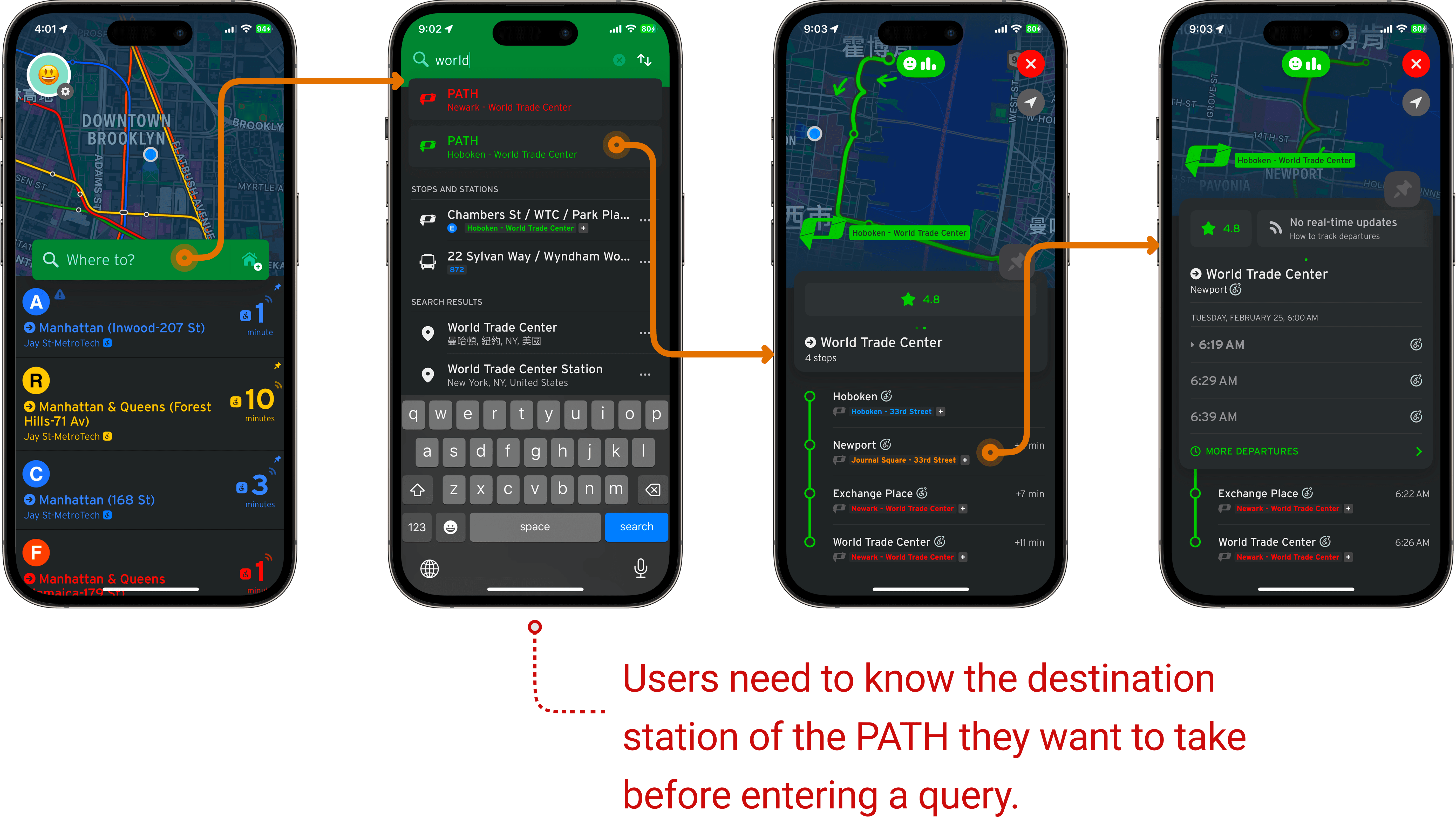Searching for the terminal station of the desired PATH line – Since the train cannot be searched by color, users enter the terminal station of the green PATH. This method successfully retrieves the train and its schedule.